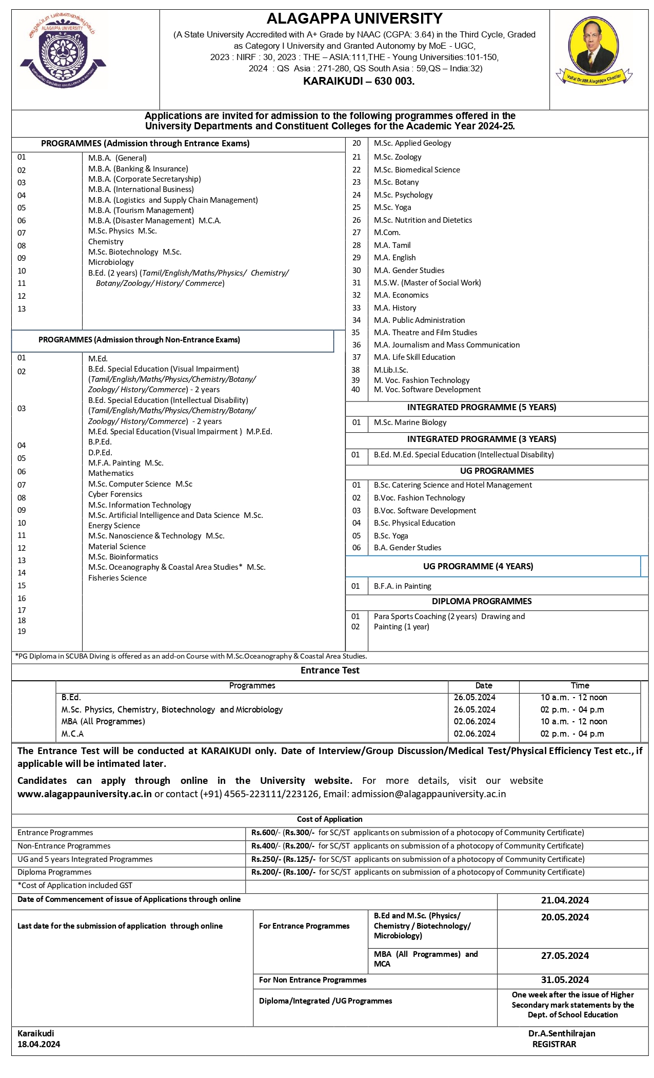 Admission is made strictly on the basis of merit and the reservation policy of Govt. of Tamil Nadu. 5% of the seats are reserved for differently-abled students in all the programmes (Government Letter No.12599/K2/2017-1, dated 21.07.2017).